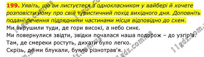 Уявіть, що ви листуєтеся з однокласником у вайбері й хочете розповісти йому про свій туристичний похід вихідного дня. Доповніть подані речення підрядними частинами місця відповідно до схем. Ми вирушили туди, де гори високі, а небо синє. Ми повернулися звідти, звідки почалася наша подорож – до узгір'я. Там, де смереки ростуть, дихати було легко. Скрізь, де ми блукали, буяло різнотрав'я.