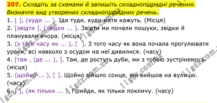 Складіть за схемами й запишіть складнопідрядні речення. Визначте вид утворених складнопідрядних речень. 1. [ ], (куди ... ). Іди туди, куди мати кажуть. (Місця) 2. [звідти ], (звідки ... ). Звідти ми почали пошуки, звідки й планували вчора. (місця) 3. (з того часу як ... ), [ ]. З того часу як вона почала прогулювати уроки, всі навколо з осудом на неї дивилися. (часу) 4. [там , (де ... ), ]. Там, де ростуть дуби, ми з тобою зустрінемось. (місця) 5. (щойно ... ), [ ]. Щойно зійшло сонце, він вийшов на вулицю. (часу) 6. [ ], (як тільки ... ). Прийди, як тільки покличу. (часу)