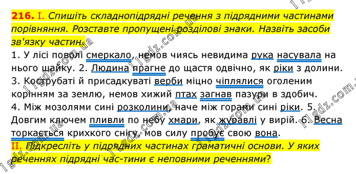 І. Спишіть складнопідрядні речення з підрядними частинами порівняння. Розставте пропущені розділові знаки. Назвіть засоби зв'язку частин. 1. У лісі поволі смеркало, немов чиясь невидима рука насувала на нього шайку. 2. Людина прагне до щастя одвічно, як ріки з долини. 3. Кострубаті й присадкуваті верби міцно чіплялися оголеним корінням за землю, немов хижий птах загнав пазури в здобич. 4. Між мозолями сині розколини, наче між горами сині ріки. 5. Довгим ключем пливли по небу хмари, як журавлі у вирій. 6. Весна торкається крихкого снігу, мов силу пробує свою вона. ІІ. Підкресліть у підрядних частинах граматичні основи. У яких реченнях підрядні частини є неповними реченнями?