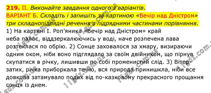 ІІ. Виконайте завдання одного з варіантів. ВАРІАНТ Б. Складіть і запишіть за картиною «Вечір над Дністром» три складнопідрядні речення з підрядними частинами порівняння. 1) На картині І. Роп’яника «Вечір над Дністром» край неба палає, віддзеркалюючись у воді, наче розпечена лава розтеклася по обрію. 2) Сонце заховалося за хмару, визираючи одним оком, ніби воно підглядало за своїм двійником, що пірнув скупатися в річку, лишивши по собі променистий слід. 3) Вітер-затих, річка приборкала течію, вся природа принишкла, ніби все довкола затамувало подих від по-казковому прекрасного прощання сонця із днем.