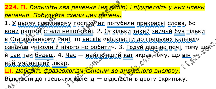 II. Випишіть два речення (на вибір) і підкресліть у них члени речення. Побудуйте схеми цих речень. 1. У цьому суєтливому поспіху ми погубили прекрасні слова, бо вони раптом стали непотрібні. 2. Оскільки такий звичай був тільки в Стародавньому Римі, то вислів «відкласти до грецьких календ» означав «ніколи й нічого не робити». 3. Годуй діда на печі, тому що й сам там будеш. 4. Час — найлютіший кат якраз тому, що він — найгуманніший лікар. III. Доберіть фразеологізм-синонім до виділеного вислову. Відкласти до грецьких календ — відкласти в довгу скриньку.