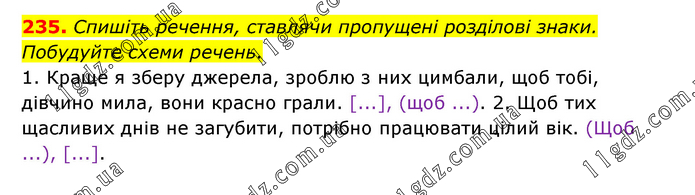 Спишіть речення, ставлячи пропущені розділові знаки. Побудуйте схеми речень. 1. Краще я зберу джерела, зроблю з них цимбали, щоб тобі, дівчино мила, вони красно грали. [...], (щоб ...). 2. Щоб тих щасливих днів не загубити, потрібно працювати цілий вік. (Щоб ...), [...].