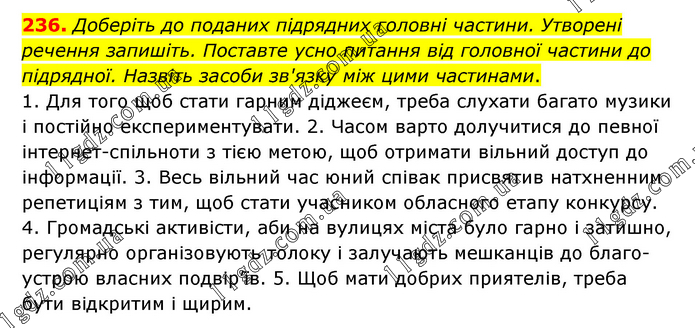 Доберіть до поданих підрядних головні частини. Утворені речення запишіть. Поставте усно питання від головної частини до підрядної. Назвіть засоби зв'язку між цими частинами. 1. Для того щоб стати гарним діджеєм, треба слухати багато музики і постійно експериментувати. 2. Часом варто долучитися до певної інтернет-спільноти з тією метою, щоб отримати вільний доступ до інформації. 3. Весь вільний час юний співак присвятив натхненним репетиціям з тим, щоб стати учасником обласного етапу конкурсу. 4. Громадські активісти, аби на вулицях міста було гарно і затишно, регулярно організовують толоку і залучають мешканців до благо-устрою власних подвір’їв. 5. Щоб мати добрих приятелів, треба бути відкритим і щирим.