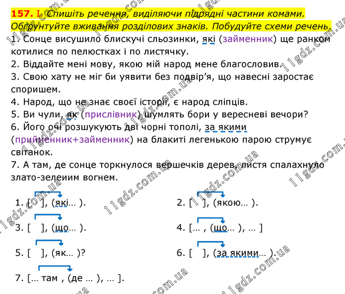І. Спишіть речення, виділяючи підрядні частини комами. Обґрунтуйте вживання розділових знаків. Побудуйте схеми речень. 1. Сонце висушило блискучі сльозинки, які (займенник) ще ранком котилися по пелюстках і по листячку. 2. Віддайте мені мову, якою мій народ мене благословив. 3. Свою хату не міг би уявити без подвір’я, що навесні заростає споришем. 4. Народ, що не знає своєї історії, є народ сліпців. 5. Ви чули, як (прислівник) шумлять бори у вересневі вечори? 6. Його очі розшукують дві чорні тополі, за якими (прийменник+займенник) на блакиті легенькою парою струмує світанок. 7. А там, де сонце торкнулося вершечків дерев, листя спалахнуло злато-зелеиим вогнем.