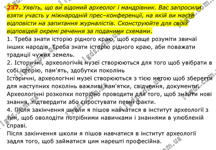 Уявіть, що ви відомий археолог і мандрівник. Вас запросили взяти участь у міжнародній прес–конференції, на якій ви маєте відповісти на запитання журналістів. Сконструюйте для своїх відповідей окремі речення за поданими схемами. 1. Треба знати історію рідного краю, щоб краще розуміти звичаї інших народів. Треба знати історію рідного краю, аби поважати традиції чужих земель. 2. Історичні, археологічні музеї створюються для того щоб увібрати в собі історію, пам'ять, здобутки поколінь Історичні, археологічні музеї створюються з тією метою щоб зберегти для наступних поколінь важливі пам'ятки, свідчення, документи. Археологічні розкопки потрібно проводити для того, щоб знайти нові знання, підтвердити або спростувати певні факти. 4. Після закінчення школи я пішов навчатися в інститут археології з тим, щоб оволодіти потрібними навичками і знаннями в улюбленій справі. Після закінчення школи я пішов навчатися в інститут археології задля того, щоб займатися цим нарешті професійна.