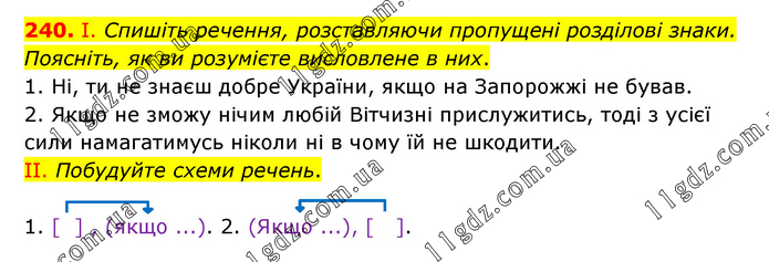 І. Спишіть речення, розставляючи пропущені розділові знаки. Поясніть, як ви розумієте висловлене в них. 1. Ні, ти не знаєш добре України, якщо на Запорожжі не бував. 2. Якщо не зможу нічим любій Вітчизні прислужитись, тоді з усієї сили намагатимусь ніколи ні в чому їй не шкодити. ІІ. Побудуйте схеми речень. 1. [ ] , (якщо ...). 2. (Якщо ...), [ ].