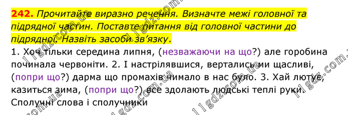 Прочитайте виразно речення. Визначте межі головної та підрядної частин. Поставте питання від головної частини до підрядної. Назвіть засоби зв’язку. 1. Хоч тільки середина липня, (незважаючи на що?) але горобина починала червоніти. 2. І настрілявшися, вертались ми щасливі, (попри що?) дарма що промахів чимало в нас було. 3. Хай лютує, казиться зима, (попри що?) все здолають людські теплі руки. Сполучні слова і сполучники.