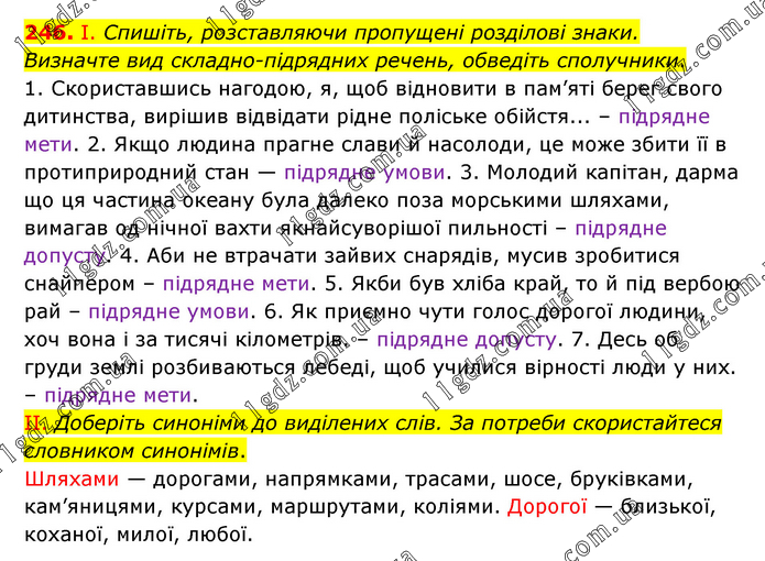 І. Спишіть, розставляючи пропущені розділові знаки. Визначте вид складнопідрядних речень, обведіть сполучники. 1. Скориставшись нагодою, я, щоб відновити в пам’яті берег свого дитинства, вирішив відвідати рідне поліське обійстя... – підрядне мети. 2. Якщо людина прагне слави й насолоди, це може збити її в протиприродний стан — підрядне умови. 3. Молодий капітан, дарма що ця частина океану була далеко поза морськими шляхами, вимагав од нічної вахти якнайсуворішої пильності – підрядне допусту. 4. Аби не втрачати зайвих снарядів, мусив зробитися снайпером – підрядне мети. 5. Якби був хліба край, то й під вербою рай – підрядне умови. 6. Як приємно чути голос дорогої людини, хоч вона і за тисячі кілометрів. – підрядне допусту. 7. Десь об груди землі розбиваються лебеді, щоб училися вірності люди у них. – підрядне мети. ІІ. Доберіть синоніми до виділених слів. За потреби скористайтеся словником синонімів. Шляхами — дорогами, напрямками, трасами, шосе, бруківками, кам’яницями, курсами, маршрутами, коліями. Дорогої — близької, коханої, милої, любої.