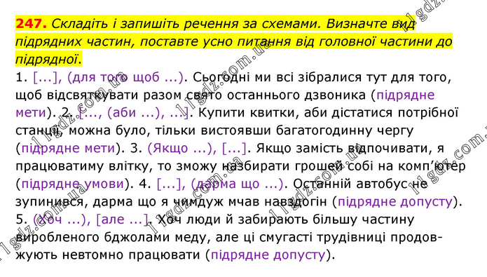 Складіть і запишіть речення за схемами. Визначте вид підрядних частин, поставте усно питання від головної частини до підрядної. 1. [...], (для того щоб ...). Сьогодні ми всі зібралися тут для того, щоб відсвяткувати разом свято останнього дзвоника (підрядне мети). 2. [..., (аби ...), ...]. Купити квитки, аби дістатися потрібної станції, можна було, тільки вистоявши багатогодинну чергу (підрядне мети). 3. (Якщо ...), [...]. Якщо замість відпочивати, я працюватиму влітку, то зможу назбирати грошей собі на комп’ютер (підрядне умови). 4. [...], (дарма що ...). Останній автобус не зупинився, дарма що я чимдуж мчав навздогін (підрядне допусту). 5. (Хоч ...), [але ...]. Хоч люди й забирають більшу частину виробленого бджолами меду, але ці смугасті трудівниці продов- жують невтомно працювати (підрядне допусту).