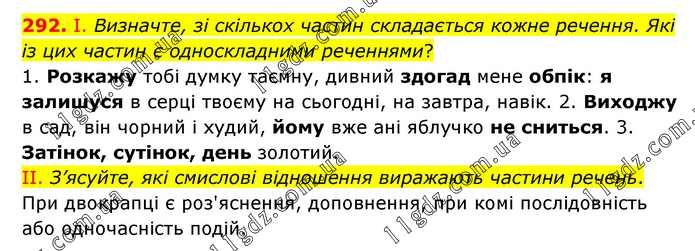І. Визначте, зі скількох частин складається кожне речення. Які із цих частин є односкладними реченнями? 1. Розкажу тобі думку таємну, дивний здогад мене обпік: я залишуся в серці твоєму на сьогодні, на завтра, навік. 2. Виходжу в сад, він чорний і худий, йому вже ані яблучко не сниться. 3. Затінок, сутінок, день золотий. II. З’ясуйте, які смислові відношення виражають частини речень. При двокрапці є роз'яснення, доповнення, при комі послідовність або одночасність подій.