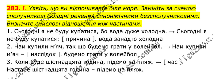 І. Уявіть, що ви відпочиваєте біля моря. Замініть за схемою сполучникові складні речення синонімічними безсполучниковими. Визначте смислові відношення між частинами. 1. Сьогодні я не буду купатися, бо вода дуже холодна. → Сьогодні я не буду купатися: [ причина ]. вода занадто холодна 2. Нам купили м’яч, так що будемо грати у волейбол. → Нам купили м’яч – [ наслідок ]. будемо грати у волейбол 3. Коли буде шістнадцята година, підемо на пляж. → [ час ] – Настане шістнадцята година – підемо на пляж.