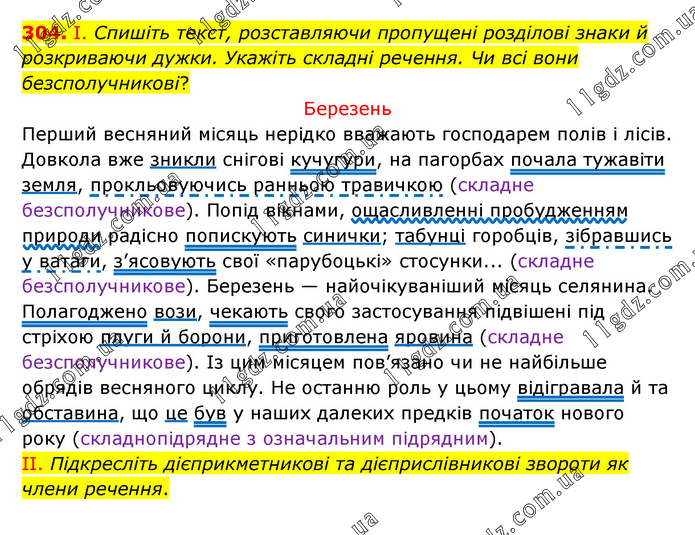 І. Спишіть текст, розставляючи пропущені розділові знаки й розкриваючи дужки. Укажіть складні речення. Чи всі вони безсполучникові? Березень Перший весняний місяць нерідко вважають господарем полів і лісів. Довкола вже зникли снігові кучугури, на пагорбах почала тужавіти земля, прокльовуючись ранньою травичкою (складне безсполучникове). Попід вікнами, ощасливленні пробудженням природи радісно попискують синички; табунці горобців, зібравшись у ватаги, з’ясовують свої «парубоцькі» стосунки... (складне безсполучникове). Березень — найочікуваніший місяць селянина. Полагоджено вози, чекають свого застосування підвішені під стріхою плуги й борони, приготовлена яровина (складне безсполучникове). Із цим місяцем пов’язано чи не найбільше обрядів весняного циклу. Не останню роль у цьому відігравала й та обставина, що це був у наших далеких предків початок нового року (складнопідрядне з означальним підрядним). ІІ. Підкресліть дієприкметникові та дієприслівникові звороти як члени речення.