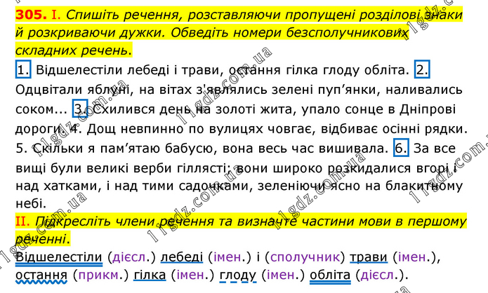 І. Спишіть речення, розставляючи пропущені розділові знаки й розкриваючи дужки. Обведіть номери безсполучникових складних речень. 1. Відшелестіли лебеді і трави, остання гілка глоду обліта. 2. Одцвітали яблуні, на вітах з'являлись зелені пуп’янки, наливались соком... 3. Схилився день на золоті жита, упало сонце в Дніпрові дороги. 4. Дощ невпинно по вулицях човгає, відбиває осінні рядки. 5. Скільки я пам’ятаю бабусю, вона весь час вишивала. 6. За все вищі були великі верби гіллясті; вони широко розкидалися вгорі і над хатками, і над тими садочками, зеленіючи ясно на блакитному небі. II. Підкресліть члени речення та визначте частини мови в першому реченні. Відшелестіли (дієсл.) лебеді (імен.) і (сполучник) трави (імен.), остання (прикм.) гілка (імен.) глоду (імен.) обліта (дієсл.).