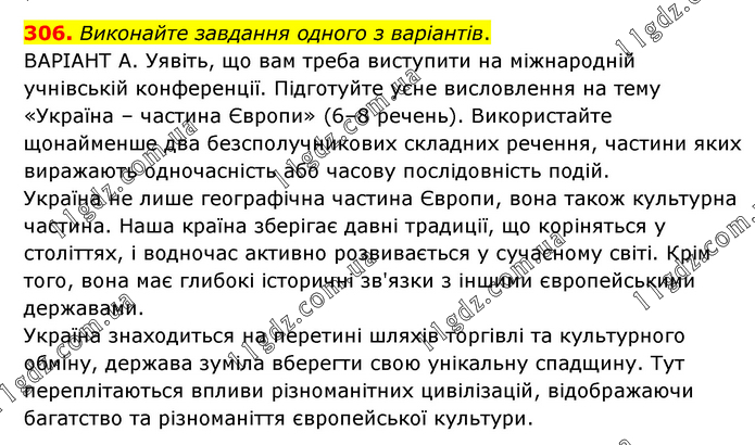Виконайте завдання одного з варіантів. ВАРІАНТ А. Уявіть, що вам треба виступити на міжнародній учнівській конференції. Підготуйте усне висловлення на тему «Україна – частина Європи» (6–8 речень). Використайте щонайменше два безсполучникових складних речення, частини яких виражають одночасність або часову послідовність подій. Україна не лише географічна частина Європи, вона також культурна частина. Наша країна зберігає давні традиції, що коріняться у століттях, і водночас активно розвивається у сучасному світі. Крім того, вона має глибокі історичні зв'язки з іншими європейськими державами. Україна знаходиться на перетині шляхів торгівлі та культурного обміну, держава зуміла вберегти свою унікальну спадщину. Тут переплітаються впливи різноманітних цивілізацій, відображаючи багатство та різноманіття європейської культури.