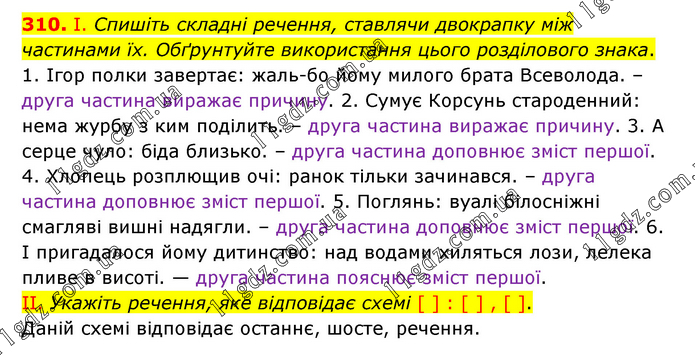 І. Спишіть складні речення, ставлячи двокрапку між частинами їх. Обґрунтуйте використання цього розділового знака. 1. Ігор полки завертає: жаль-бо йому милого брата Всеволода. – друга частина виражає причину. 2. Сумує Корсунь староденний: нема журбу з ким поділить. – друга частина виражає причину. 3. А серце чуло: біда близько. – друга частина доповнює зміст першої. 4. Хлопець розплющив очі: ранок тільки зачинався. – друга частина доповнює зміст першої. 5. Поглянь: вуалі білосніжні смагляві вишні надягли. – друга частина доповнює зміст першої. 6. І пригадалося йому дитинство: над водами хиляться лози, лелека пливе в висоті. — друга частина пояснює зміст першої. II. Укажіть речення, яке відповідає схемі [ ] : [ ] , [ ]. Даній схемі відповідає останнє, шосте, речення.
