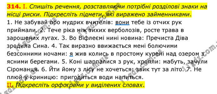 І. Спишіть речення, розставляючи потрібні розділові знаки на місці риски. Підкресліть підмети, які виражено займенниками. 1. Не забувай про мудрих вчителів: вони тебе із отчих рук приймали. 2. Тече ріка між тихих верболозів, росте трава в зарошених лугах. 3. Во Віфлеємі нині новина: Пречиста Діва зродила Сина. 4. Так виразно ввижається мені болючими безсонними ночами: я жив колись в простому курені над озером з ясними берегами. 5. Коні шарпалися з рук, хропли: мабуть, зачули Сіроманця. 6. Йти йому з лісу не хочеться: звик тут за літо. 7. Не плюй у криницю: пригодиться води напиться. ІІ. Підкресліть орфограми у виділених словах.