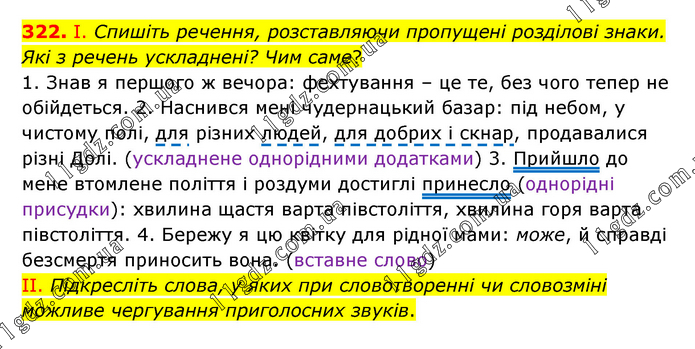 І. Спишіть речення, розставляючи пропущені розділові знаки. Які з речень ускладнені? Чим саме? 1. Знав я першого ж вечора: фехтування – це те, без чого тепер не обійдеться. 2. Наснився мені чудернацький базар: під небом, у чистому полі, для різних людей, для добрих і скнар, продавалися різні Долі. (ускладнене однорідними додатками) 3. Прийшло до мене втомлене поліття і роздуми достиглі принесло (однорідні присудки): хвилина щастя варта півстоліття, хвилина горя варта півстоліття. 4. Бережу я цю квітку для рідної мами: може, й справді безсмертя приносить вона. (вставне слово) ІІ. Підкресліть слова, у яких при словотворенні чи словозміні можливе чергування приголосних звуків.
