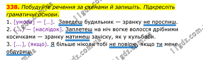 Побудуйте речення за схемами й запишіть. Підкресліть граматичні основи. 1. [умова] — […]. Заведеш будильник — зранку не проспиш. 2. (...) — [наслідок]. Заплетеш на ніч вогке волосся дрібними косичками — зранку матимеш зачіску, як у кульбаби. 3. [...], (якщо). Я більше ніколи тобі не повірю, якщо ти мене обдуриш.