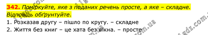Поміркуйте, яке з поданих речень просте, а яке – складне. Відповідь обґрунтуйте. 1. Розказав другу – пішло по кругу. – складне 2. Життя без книг – це хата без вікна. – просте