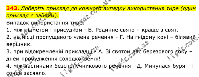 Доберіть приклад до кожного випадку використання тире (один приклад є зайвим). Випадок використання тире: 1. між підметом і присудком - Б. Родинне свято – краще з свят. 2. на місці пропущеного члена речення - Г. На гнідому коні – білявий вершник. 3. при відокремленій прикладці - А. Зі святом вас березового соку – днем пробудження солодкої землі! 4. між частинами безсполучникового речення - Д. Минулася буря – і сонце засяяло.