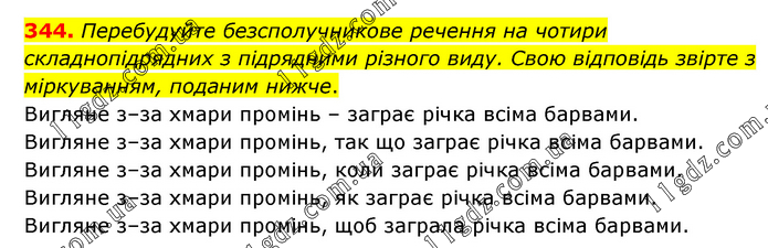 Перебудуйте безсполучникове речення на чотири складнопідрядних з підрядними різного виду. Свою відповідь звірте з міркуванням, поданим нижче. Вигляне з–за хмари промінь – заграє річка всіма барвами. Вигляне з–за хмари промінь, так що заграє річка всіма барвами. Вигляне з–за хмари промінь, коли заграє річка всіма барвами. Вигляне з–за хмари промінь, як заграє річка всіма барвами. Вигляне з–за хмари промінь, щоб заграла річка всіма барвами.