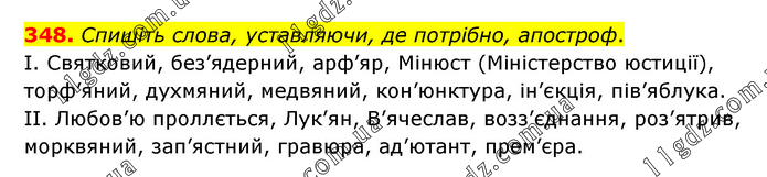 Спишіть слова, уставляючи, де потрібно, апостроф. I. Святковий, без’ядерний, арф’яр, Мінюст (Міністерство юстиції), торф’яний, духмяний, медвяний, кон’юнктура, ін’єкція, пів’яблука. II. Любов’ю проллється, Лук’ян, В’ячеслав, возз’єднання, роз’ятрив, морквяний, зап’ястний, гравюра, ад’ютант, прем’єра.