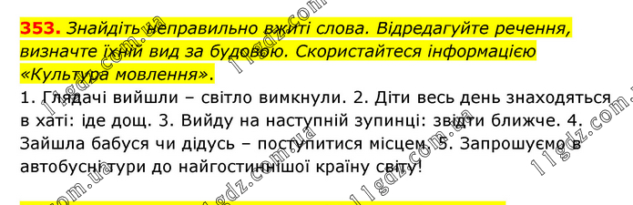 Знайдіть неправильно вжиті слова. Відредагуйте речення, визначте їхній вид за будовою. Скористайтеся інформацією «Культура мовлення». 1. Глядачі вийшли – світло вимкнули. 2. Діти весь день знаходяться в хаті: іде дощ. 3. Вийду на наступній зупинці: звідти ближче. 4. Зайшла бабуся чи дідусь – поступитися місцем. 5. Запрошуємо в автобусні тури до найгостиннішої країну світу!
