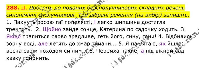ІІ. Доберіть до поданих безсполучникових складних речень синонімічні сполучникові. Три дібрані речення (на вибір) запишіть. 1. Пахнуть росою гаї попелясті, і легко шипшина достигла тремтить. 2. Щойно зайде сонце, Катерина по садочку ходить. 3. Якщо трапиться слово зрадливе, геть його, сину, гони! 4. Відбились зорі у воді, але летять до хмар тумани... 5. Я пам’ятаю, як йшла весна своїм походом смілим... 6. Черемха пахне, а під вікном сад казку гомонить.