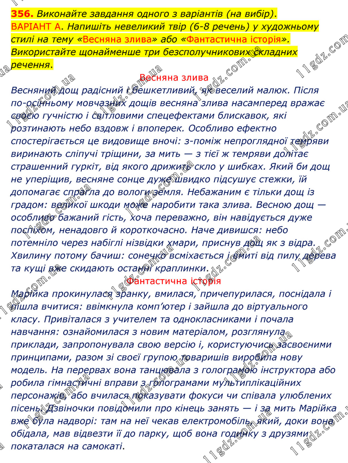Виконайте завдання одного з варіантів (на вибір). ВАРІАНТ А. Напишіть невеликий твір (6-8 речень) у художньому стилі на тему «Весняна злива» або «Фантастична історія». Використайте щонайменше три безсполучникових складних речення. Весняна злива Весняний дощ радісний і бешкетливий, як веселий малюк. Після по-осінньому мовчазних дощів весняна злива насамперед вражає своєю гучністю і світловими спецефектами блискавок, які розтинають небо вздовж і впоперек. Особливо ефектно спостерігається це видовище вночі: з-поміж непроглядної темряви виринають сліпучі тріщини, за мить — з тієї ж темряви долітає страшенний гуркіт, від якого дрижить скло у шибках. Який би дощ не уперіщив, весняне сонце дуже швидко підсушує стежки, їй допомагає спрагла до вологи земля. Небажаним є тільки дощ із градом: великої шкоди може наробити така злива. Весною дощ — особливо бажаний гість, хоча переважно, він навідується дуже поспіхом, ненадовго й короткочасно. Наче дивишся: небо потемніло через набіглі нізвідки хмари, приснув дощ як з відра. Хвилину потому бачиш: сонечко всміхається і вмиті від пилу дерева та кущі вже скидають останні краплинки. Фантастична історія Марійка прокинулася зранку, вмилася, причепурилася, поснідала і пішла вчитися: ввімкнула комп’ютер і зайшла до віртуального класу. Привіталася з учителем та однокласниками і почала навчання: ознайомилася з новим матеріалом, розглянула приклади, запропонувала свою версію і, користуючись засвоєними принципами, разом зі своєї групою товаришів виробила нову модель. На перервах вона танцювала з голограмою інструктора або робила гімнастичні вправи з голограмами мультиплікаційних персонажів, або вчилася показувати фокуси чи співала улюблених пісень. Дзвіночки повідомили про кінець занять — і за мить Марійка вже була надворі: там на неї чекав електромобіль, який, доки вона обідала, мав відвезти її до парку, щоб вона годинку з друзями покаталася на самокаті.
