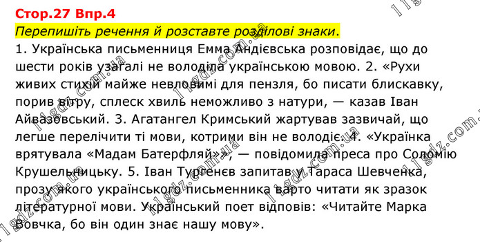 Впр.4 Перепишіть речення й розставте розділові знаки. 1. Українська письменниця Емма Андієвська розповідає, що до шести років узагалі не володіла українською мовою. 2. «Рухи живих стихій майже невловимі для пензля, бо писати блискавку, порив вітру, сплеск хвиль неможливо з натури, — казав Іван Айвазовський. 3. Агатангел Кримський жартував зазвичай, що легше перелічити ті мови, котрими він не володіє. 4. «Українка врятувала «Мадам Батерфляй»», — повідомила преса про Соломію Крушельницьку. 5. Іван Тургенєв запитав у Тараса Шевченка, прозу якого українського письменника варто читати як зразок літературної мови. Український поет відповів: «Читайте Марка Вовчка, бо він один знає нашу мову».