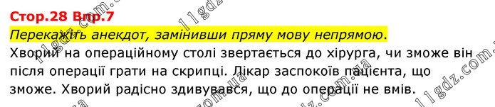 Впр.7 Перекажіть анекдот, замінивши пряму мову непрямою. Хворий на операційному столі звертається до хірурга, чи зможе він після операції грати на скрипці. Лікар заспокоїв пацієнта, що зможе. Хворий радісно здивувався, що до операції не вмів.