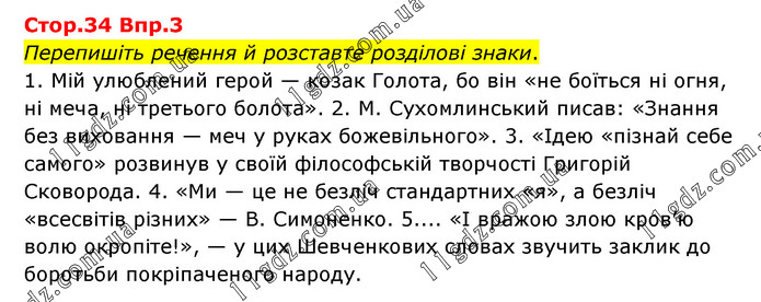 Впр.3 Перепишіть речення й розставте розділові знаки. 1. Мій улюблений герой — козак Голота, бо він «не боїться ні огня, ні меча, ні третього болота». 2. М. Сухомлинський писав: «Знання без виховання — меч у руках божевільного». 3. «Ідею «пізнай себе самого» розвинув у своїй філософській творчості Григорій Сковорода. 4. «Ми — це не безліч стандартних «я», а безліч «всесвітів різних» — В. Симоненко. 5.... «І вражою злою кров’ю волю окропіте!», — у цих Шевченкових словах звучить заклик до боротьби покріпаченого народу.
