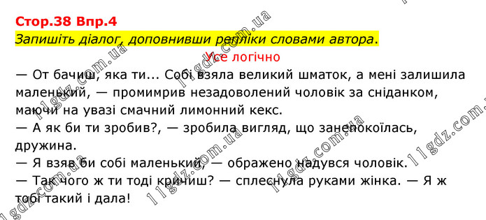 Запишіть діалог, доповнивши репліки словами автора. Усе логічно — От бачиш, яка ти... Собі взяла великий шматок, а мені залишила маленький, — промимрив незадоволений чоловік за сніданком, маючи на увазі смачний лимонний кекс. — А як би ти зробив?, — зробила вигляд, що занепокоїлась, дружина. — Я взяв би собі маленький, — ображено надувся чоловік. — Так чого ж ти тоді кричиш? — сплеснула руками жінка. — Я ж тобі такий і дала!