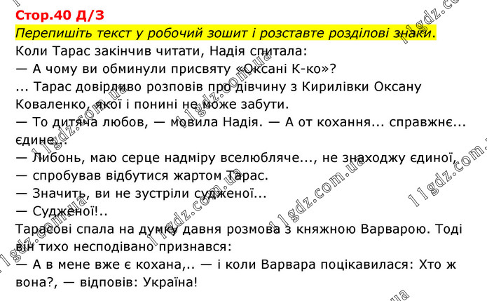 Перепишіть текст у робочий зошит і розставте розділові знаки. Коли Тарас закінчив читати, Надія спитала: — А чому ви обминули присвяту «Оксані К-ко»? ... Тарас довірливо розповів про дівчину з Кирилівки Оксану Коваленко, якої і понині не може забути. — То дитяча любов, — мовила Надія. — А от кохання... справжнє... єдине... — Либонь, маю серце надміру вселюбляче..., не знаходжу єдиної, — спробував відбутися жартом Тарас. — Значить, ви не зустріли судженої... — Судженої!.. Тарасові спала на думку давня розмова з княжною Варварою. Тоді він тихо несподівано признався: — А в мене вже є кохана,.. — і коли Варвара поцікавилася: Хто ж вона?, — відповів: Україна!