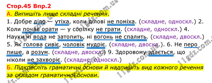 Впр.2 А. Випишіть лише складні речення. 1. Добре діло — утіха, коли ділові не поміха. (складне, односкл.) 2. Коли почав орати — у сопілку не грати. (складне, односкл.) 4. Науки ні вода не затопить, ні вогонь не спалить. (складне, двоскл.) 5. Як голова сивіє, чоловік мудріє. (складне, двоскл.). 6. Не перо пише, а розум. (складне, двоскл.) 9. Здоровому здається, що ніколи не захворіє. (складне, односкл.) Б. Підкресліть граматичні основи й надпишіть вид кожного речення за складом граматичної основи.