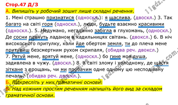 А. Випишіть у робочий зошит лише складні речення. 1. Мені страшно признатися (односкл.): я щаслива, (двоскл.) 3. Так багато на світі горя (односкл.), люди, будьте взаємно красивими (односкл.). 5. Недумано, негаданно забігла в глухомань, (односкл.) Де сосни пахнуть ладаном в кадильницях світань. (двоксл.) 6. В ніч високосного притулку, коли йде обертом земля, ти до плеча мене притулиш безсмертним рухом скрипаля, (обидва реч. двоксл.) 7. Рятуй мене, врятуй мене, (односкл.) бо гине моя душа, задивлена в чужу. (двоскл.) 8. У світі злому і холодному, де щастя зіткане з прощань, чи ми пробачим одне одному цю несподівану печаль? (обидва реч. двоскл.). Б. Підкресліть у них граматичні основи. В. Над кожним простим реченням напишіть його вид за складом граматичної основи.