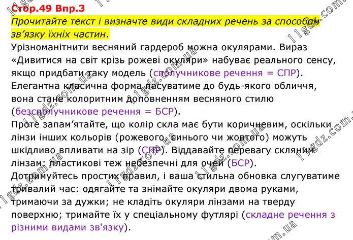 Впр.3 Прочитайте текст і визначте види складних речень за способом зв’язку їхніх частин. Урізноманітнити весняний гардероб можна окулярами. Вираз «Дивитися на світ крізь рожеві окуляри» набуває реального сенсу, якщо придбати таку модель (сполучникове речення = СПР). Елегантна класична форма пасуватиме до будь-якого обличчя, вона стане колоритним доповненням весняного стилю (безсполучникове речення = БСР). Проте запам’ятайте, що колір скла має бути коричневим, оскільки лінзи інших кольорів (рожевого, синього чи жовтого) можуть шкідливо впливати на зір (СПР). Віддавайте перевагу скляним лінзам: пластикові теж небезпечні для очей (БСР). Дотримуйтесь простих правил, і ваша стильна обновка слугуватиме тривалий час: одягайте та знімайте окуляри двома руками, тримаючи за дужки; не кладіть окуляри лінзами на тверду поверхню; тримайте їх у спеціальному футлярі (складне речення з різними видами зв'язку).