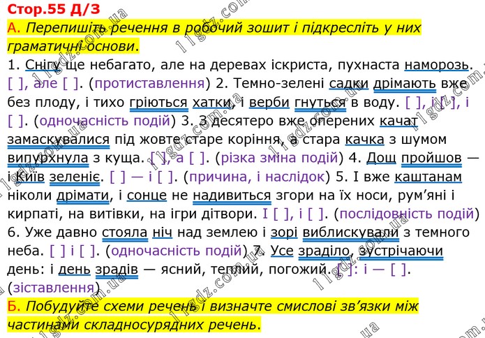 А. Перепишіть речення в робочий зошит і підкресліть у них граматичні основи. 1. Снігу ще небагато, але на деревах іскриста, пухнаста наморозь. [ ], але [ ]. (протиставлення) 2. Темно-зелені садки дрімають вже без плоду, і тихо гріються хатки, і верби гнуться в воду. [ ], і [ ], і [ ]. (одночасність подій) 3. З десятеро вже оперених качат замаскувалися під жовте старе коріння, а стара качка з шумом випурхнула з куща. [ ], а [ ]. (різка зміна подій) 4. Дощ пройшов — і Київ зеленіє. [ ] — і [ ]. (причина, і наслідок) 5. І вже каштанам ніколи дрімати, і сонце не надивиться згори на їх носи, рум’яні і кирпаті, на витівки, на ігри дітвори. І [ ], і [ ]. (послідовність подій) 6. Уже давно стояла ніч над землею і зорі виблискували з темного неба. [ ] і [ ]. (одночасність подій) 7. Усе зраділо, зустрічаючи день: і день зрадів — ясний, теплий, погожий. [ ]: і — [ ]. (зіставлення) Б. Побудуйте схеми речень і визначте смислові зв’язки між частинами складносурядних речень.