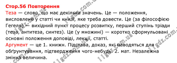Повторення Теза — слово, що має декілька значень. Це — положення, висловлене у статті чи книзі, яке треба довести. Це (за філософією Гегеля) — вихідний пункт процесу розвитку, перший ступінь тріади (теза, антитеза, синтез). Це (у множині) — коротко сформульовані основні положення доповіді, лекції, статті. Аргумент — це 1. книжн. Підстава, доказ, які наводяться для обґрунтування, підтвердження чого-небудь. 2. мат. Незалежна змінна величина.