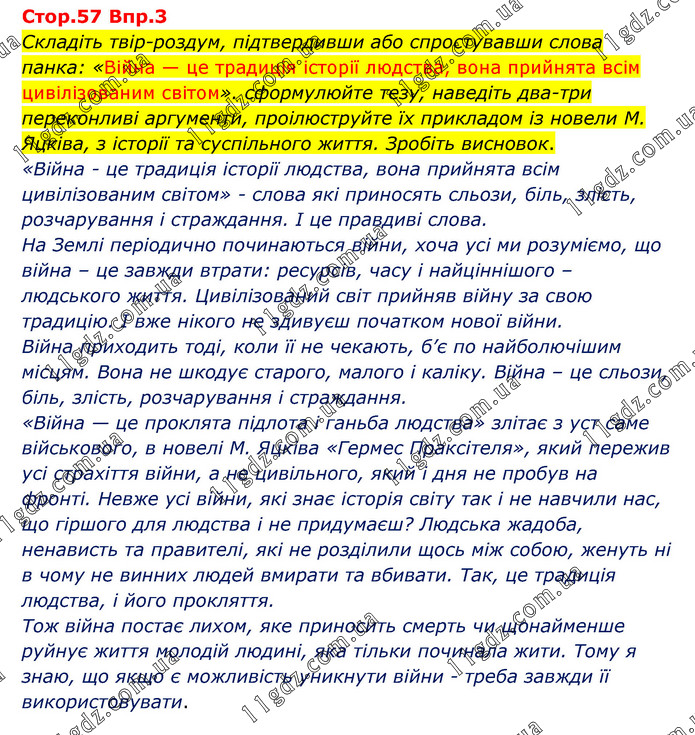 Впр.3 Складіть твірроздум, підтвердивши або спростувавши слова панка: «Війна — це традиція історії людства, вона прийнята всім цивілізованим світом». сформулюйте тезу, наведіть дватри переконливі аргументи, проілюструйте їх прикладом із новели М. Яцківа, з історії та суспільного життя. Зробіть висновок. «Війна - це традиція історії людства, вона прийнята всім цивілізованим світом» - слова які приносять сльози, біль, злість, розчарування і страждання. І це правдиві слова. На Землі періодично починаються війни, хоча усі ми розуміємо, що війна – це завжди втрати: ресурсів, часу і найціннішого – людського життя. Цивілізований світ прийняв війну за свою традицію. І вже нікого не здивуєш початком нової війни. Війна приходить тоді, коли її не чекають, б’є по найболючішим місцям. Вона не шкодує старого, малого і каліку. Війна – це сльози, біль, злість, розчарування і страждання. «Війна — це проклята підлота і ганьба людства» злітає з уст саме військового, в новелі М. Яцківа «Гермес Праксітеля», який пережив усі страхіття війни, а не цивільного, який і дня не пробув на фронті. Невже усі війни, які знає історія світу так і не навчили нас, що гіршого для людства і не придумаєш? Людська жадоба, ненависть та правителі, які не розділили щось між собою, женуть ні в чому не винних людей вмирати та вбивати. Так, це традиція людства, і його прокляття. Тож війна постає лихом, яке приносить смерть чи щонайменше руйнує життя молодій людині, яка тільки починала жити. Тому я знаю, що якщо є можливість уникнути війни - треба завжди її використовувати.