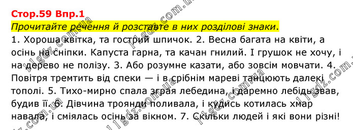 Впр.1 Прочитайте речення й розставте в них розділові знаки. 1. Хороша квітка, та гострий шпичок. 2. Весна багата на квіти, а осінь на сніпки. Капуста гарна, та качан гнилий. І грушок не хочу, і на дерево не полізу. 3. Або розумне казати, або зовсім мовчати. 4. Повітря тремтить від спеки — і в срібнім мареві танцюють далекі тополі. 5. Тихо-мирно спала зграя лебедина, і даремно лебідь звав, будив її. 6. Дівчина троянди поливала, і кудись котилась хмар навала, і сміялась осінь за вікном. 7. Скільки людей і які вони різні!