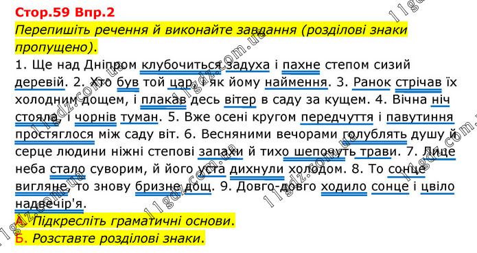 Впр.2 Перепишіть речення й виконайте завдання (розділові знаки пропущено). 1. Ще над Дніпром клубочиться задуха і пахне степом сизий деревій. 2. Хто був той цар, і як йому наймення. 3. Ранок стрічав їх холодним дощем, і плакав десь вітер в саду за кущем. 4. Вічна ніч стояла, і чорнів туман. 5. Вже осені кругом передчуття і павутиння простяглося між саду віт. 6. Весняними вечорами голублять душу й серце людини ніжні степові запахи й тихо шепочуть трави. 7. Лице неба стало суворим, й його уста дихнули холодом. 8. То сонце вигляне, то знову бризне дощ. 9. Довго-довго ходило сонце і цвіло надвечір'я. А. Підкресліть граматичні основи. Б. Розставте розділові знаки.