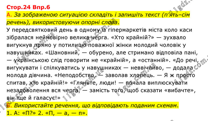Впр.6 А. За зображеною ситуацією складіть і запишіть текст (п’ять–сім речень), використовуючи опорні слова. У передсвятковий день в одному із гіпермаркетів міста коло каси зібралася неймовірно велика черга. «Хто крайній?» — зухвало вигукнув прямо у потилицю поважної жінки молодий чоловік у навушниках. «Шановний, — обурено, але стримано відповіла пані, — українською слід говорити не «крайній», а «останній». «До речі, вигукувати і спілкуватись у навушниках — неввічливо, — додала молода дівчина. «Неподобство, — заволав хлопець. — Я ж просто спитав, хто крайній!» «Гляньте, люди! — почала виплюскувати незадоволення вся черга, — замість того, щоб сказати «вибачте», він іще й галасує!» Б. Використайте речення, що відповідають поданим схемам. 1. А: «П?» 2. «П, — а, — п».