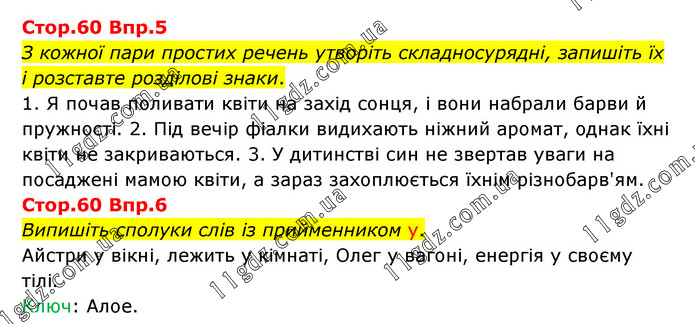 Впр.5 З кожної пари простих речень утворіть складносурядні, запишіть їх і розставте розділові знаки. 1. Я почав поливати квіти на захід сонця, і вони набрали барви й пружності. 2. Під вечір фіалки видихають ніжний аромат, однак їхні квіти не закриваються. 3. У дитинстві син не звертав уваги на посаджені мамою квіти, а зараз захоплюється їхнім різнобарв'ям. Стор.60 Впр.6 Випишіть сполуки слів із прийменником у. Айстри у вікні, лежить у кімнаті, Олег у вагоні, енергія у своєму тілі. Ключ: Алое.