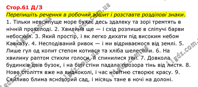 Перепишіть речення в робочий зошит і розставте розділові знаки. 1. Тільки невсипуще море бухає десь здалеку та зорі тремтять в нічній прохолоді. 2. Хвилина ще — і схід розпише в сліпучі барви небосхил. 3. Який простір, і як легко дихати під високим небом Кавказу. 4. Несподіваний ривок — і ми відриваємося від землі. 5. Лише гул од копит степом котився та хліба шелестіли. 6. На хвилину раптом стихли голоси, й спинилися тіні. 7. Довкола будинків цвів бузок, і на білі стіни падала прозора тінь від листя. 8. Нове століття вже на видноколі, і час новітню створює красу. 9. Сяйливо блима яснозорий сад, і місяць тане в ночі на долоні.