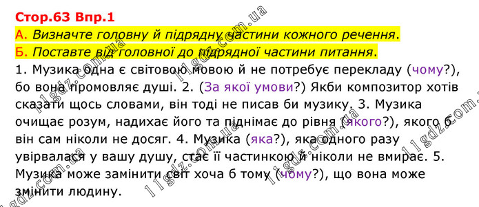 Впр.1 А. Визначте головну й підрядну частини кожного речення. Б. Поставте від головної до підрядної частини питання. 1. Музика одна є світовою мовою й не потребує перекладу (чому?), бо вона промовляє душі. 2. (За якої умови?) Якби композитор хотів сказати щось словами, він тоді не писав би музику. 3. Музика очищає розум, надихає його та піднімає до рівня (якого?), якого б він сам ніколи не досяг. 4. Музика (яка?), яка одного разу увірвалася у вашу душу, стає її частинкою й ніколи не вмирає. 5. Музика може замінити світ хоча б тому (чому?), що вона може змінити людину.