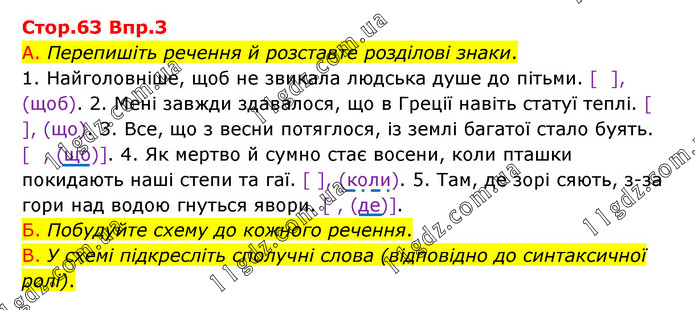 Впр.3 А. Перепишіть речення й розставте розділові знаки. 1. Найголовніше, щоб не звикала людська душе до пітьми. [ ], (щоб). 2. Мені завжди здавалося, що в Греції навіть статуї теплі. [ ], (що). 3. Все, що з весни потяглося, із землі багатої стало буять. [ , (що)]. 4. Як мертво й сумно стає восени, коли пташки покидають наші степи та гаї. [ ], (коли). 5. Там, де зорі сяють, з-за гори над водою гнуться явори. [ , (де)]. Б. Побудуйте схему до кожного речення. В. У схемі підкресліть сполучні слова (відповідно до синтаксичної ролі).