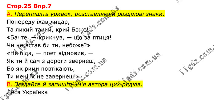 Впр.7 А. Перепишіть уривок, розставляючи розділові знаки. Попереду їхав лицар, Та лихий такий, крий Боже! «Бачте, — крикнув, — що за птиця! Чи не встав би ти, небоже?» «Не біда, — поет відмовив, — Як ти й сам з дороги звернеш, Бо як рими повтікають, Ти мені їх не завернеш!» В. Згадайте й запишіть ім’я автора цих рядків. Леся Українка