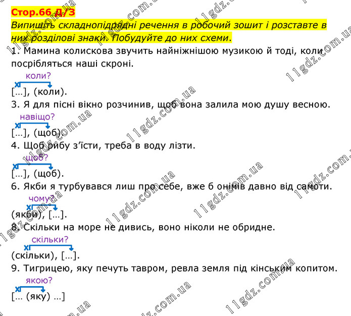 Випишіть складнопідрядні речення в робочий зошит і розставте в них розділові знаки. Побудуйте до них схеми. 1. Мамина колискова звучить найніжнішою музикою й тоді, коли посрібляться наші скроні. коли? […], (коли). 3. Я для пісні вікно розчинив, щоб вона залила мою душу весною. навіщо? […], (щоб). 4. Щоб рибу з’їсти, треба в воду лізти. щоб? […], (щоб). 6. Якби я турбувався лиш про себе, вже б онімів давно від самоти. чому? (якби), […]. 8. Скільки на море не дивись, воно ніколи не обридне. скільки? (скільки), […]. 9. Тигрицею, яку печуть тавром, ревла земля під кінським копитом. якою? [… (яку) …]