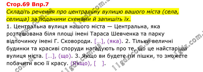 Впр.7 Складіть речення про центральну вулицю вашого міста (села, селища) за поданими схемами й запишіть їх. 1. Центральна вулиця нашого міста — Центральна, яка розташована біля площі імені Тараса Шевченка та парку відпочинку імені Г. Сковороди. […], (яка). 2. Тільки величні будинки та красиві споруди нагадують про те, що це найстаріша вулиця міста. […], (що). 3. Якщо ви будете іти пішки, то зможете побачити всю її красу. (Якщо), [ ].